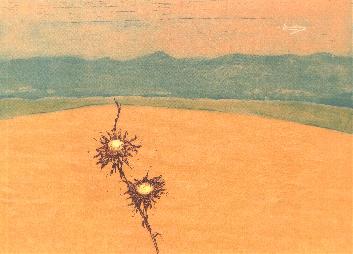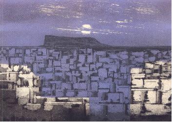 su inquietante oferta. Son paisajes del desvelo íntimo y transcriben, mediante las tramas encendidas de su visión, un mensaje ignoto que llega de recónditos enclaves de la memoria. Por eso en sus estampas cobran un valor singular las huellas evocadoras del enigma vivido.