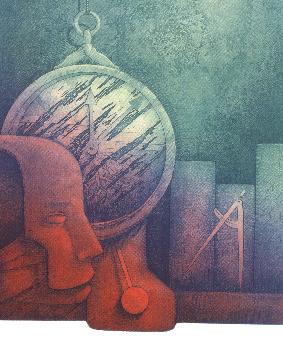En esta última su compromiso es Julio, para cuya alegoría configura una lámina onírica que preside un inmenso reloj varado más allá de las doce. Desde los tonos cálidos de la base, con mordido saliente del recuadro, la composición evoluciona hacia unos turquesas espectrales, que definen la pared húmeda del fondo. Algo así como la máscara del tiempo, podría decirse, puesto que una máscara completa esta suerte de bodegón simbólico en el que los frutos o los animales se han trocado en objetos, en formas, en volúmenes precisos y misteriosos, paralizados por el tiempo o atemporales e inquietantes... Ilustra su otra lámina la