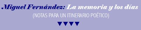 poética de la experiencia; evocación nostálgica y crítica de la infancia difícil y, sobre todo, la búsqueda de un nuevo lenguaje que había de servir como instrumento para conocer el mundo…(5). Pero es importante destacar una circunstancia que concurre en Miguel Fernández y es el hecho de su condición de poeta aislado, de autor que escribe desde otro continente y en medio de una encrucijada de culturas que ha dejado huella evidente en su obra. Acaso desde aquí aporta su singularidad el escritor: la que incorpora las claves contemporáneas de una situación fronteriza.